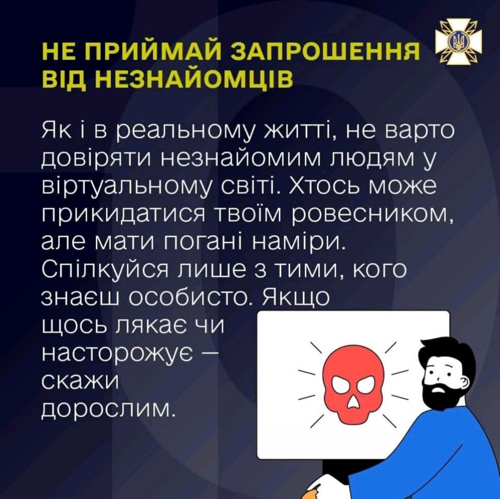 • Не відпускайте дитину на зустріч з новими друзями, що знайшлись через мережу Інтернет, якщо ви нічого про них не знаєте або у вас виникають певні сумніви щодо безпечності цієї зустрічі.